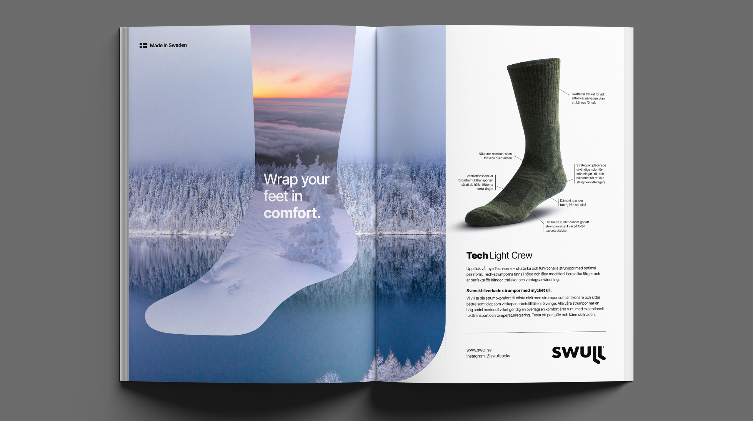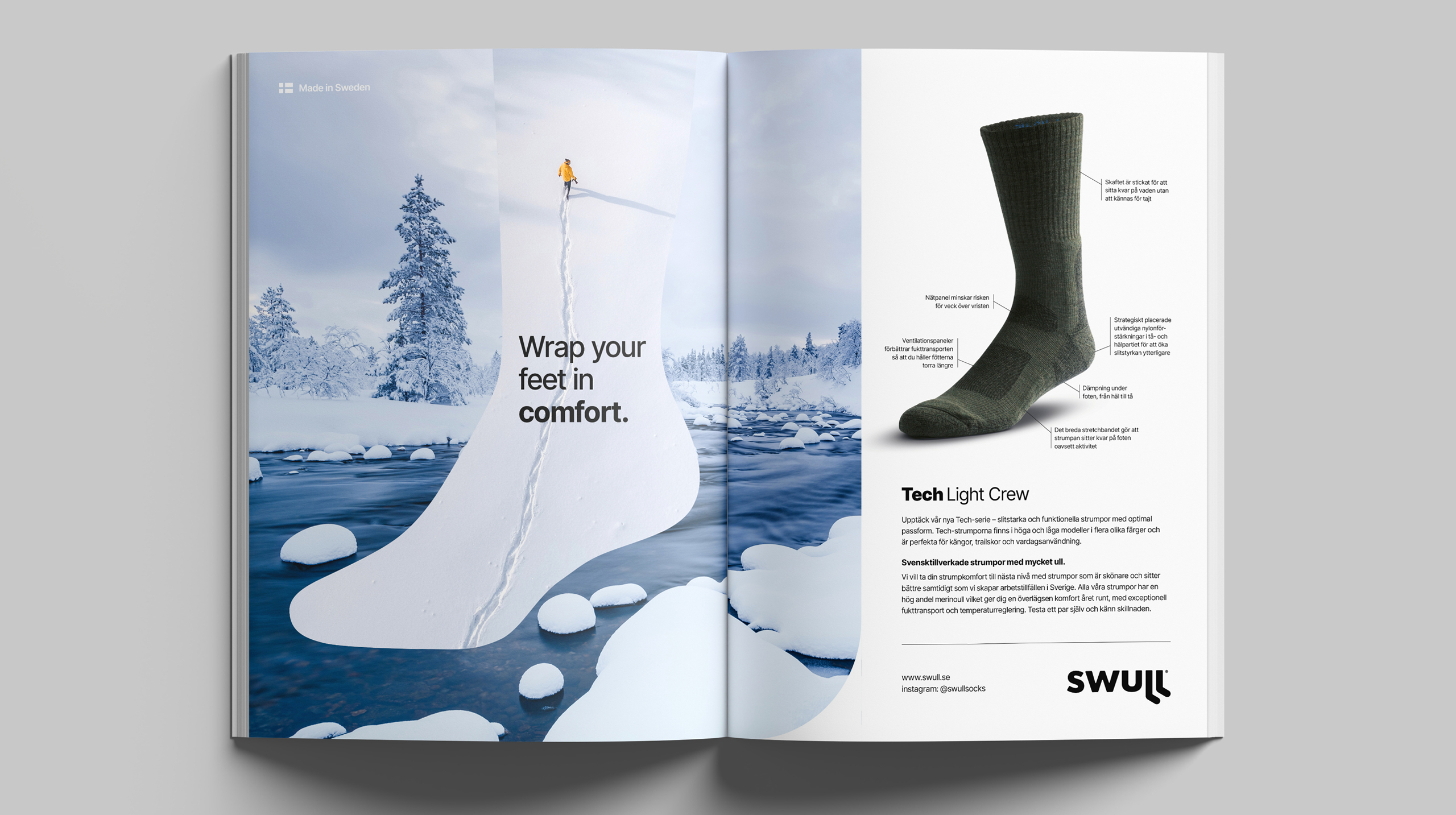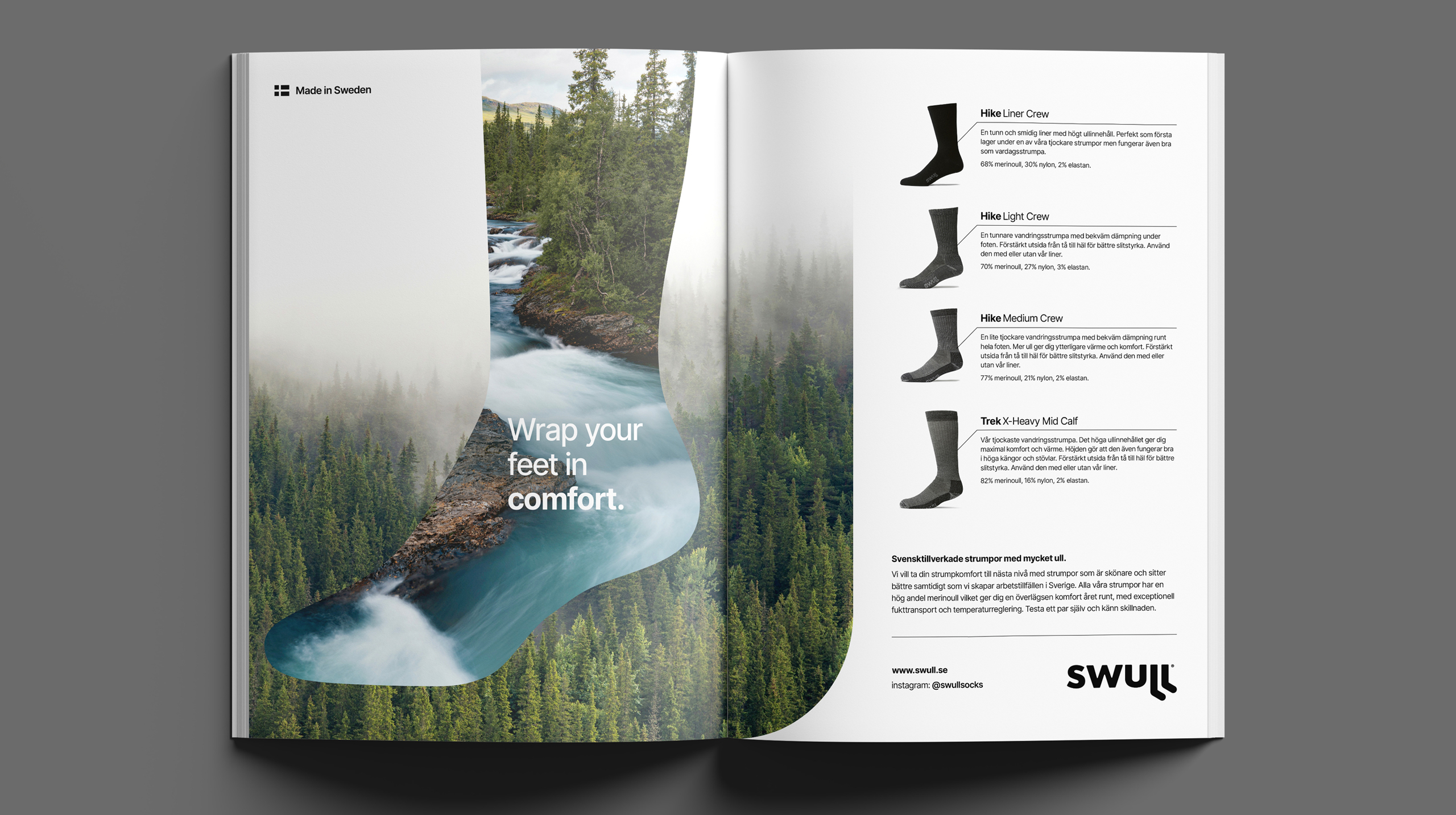 Med många års erfarenhet i bagaget vill det nystartade svenska strumpmärket swull ta ullstrumpor till nästa nivå. De har sin produktion i Sverige och alla strumpor tillverkas med en hög andel utvald merinoull vilket ger överlägsen komfort året runt. En liten del syntetfibrer förbättrar passformen och ökar slitstyrkan. Det gör att strumporna inte bara sitter bättre på foten utan också behåller sin form och prestanda över tid. Sköna strumpor med ovanligt mycket ull, bättre passform och längre livslängd som dessutom skapar arbetstillfällen i Sverige. Studio Palmbäck har varit med från början. Vi har tagit fram hela grafiska identiteten med namn, logotyp, förpackning, illustrationer och hemsida. Tack vare ett nära samarbete speglar den visuella identiteten och kommunikationen swulls vision.